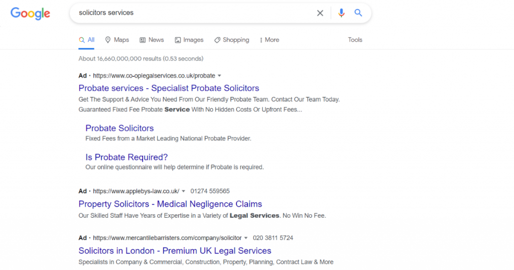 As mentioned before, Google search campaigns are based on keywords and text ads. Keywords are essentially what people search on Google, so if you choose to bid on the keyword “solicitors services” then you will show up on Google for this search (see below). Now, of course, it isn’t this simple as there are several other factors that you need to consider when making your search campaigns, but that’s the idea.
