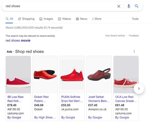 Well, Google shopping campaigns are displayed as an image, and then your product description such as price, reviews, special offers etc. For example, if you are selling red shoes and somebody searches for red shoes, they will see something like this (see below).